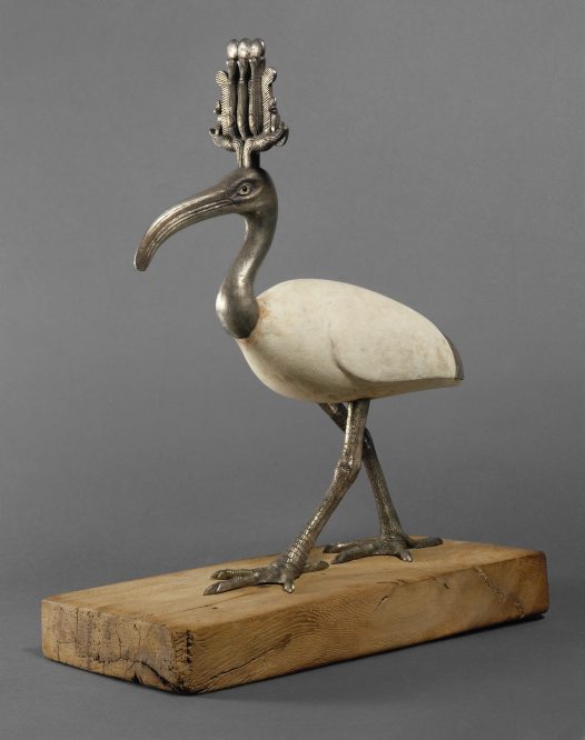 The Ibis was a bird particularly sacred to the ancient Egyptians. Being a hearts shaped it represented the heart under the protection of Thoth/Hermes, the god of wisdom learning and writing. When fleeing from the giant Typhon Hermes changed himself into an Ibis. This bird is also sacred to Isis, symbolizing the moon as the hawk symbolizes the sun. The moon god Aah is also sometimes seen as having the head of Ibis. The white Ibis appears in Lower Egypt during the time when inundation of the Nile takes place, making it especially sacred.