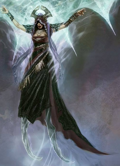 One of the Eumenides (Furies) from Graeco-Roman tradition. Tisiphone, whose name means retaliation, was the avenger of murder. She sat at night at the entrance to hell armed with a whip with which she inflicted cruel punishments on criminals. She wore a bloody robe and had serpents instead of hair.