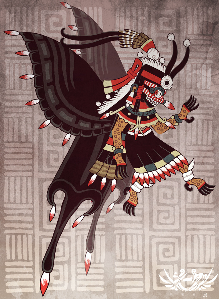 This Aztec deity is typically in the form of a butterfly. When in this form, it represents the soul, which all life forms share. She, at times, takes on the form of a dear and linked with agriculture. Itzpapalotl is a female, and her male counterpart is Itzlacoliohqui (Carved Obsidian Knife), representing matter in its unconscious state. Tezcatlipoca is responsible for the spark of life. These three Aztec divinities form a trinity that guards the different conditions of life.
